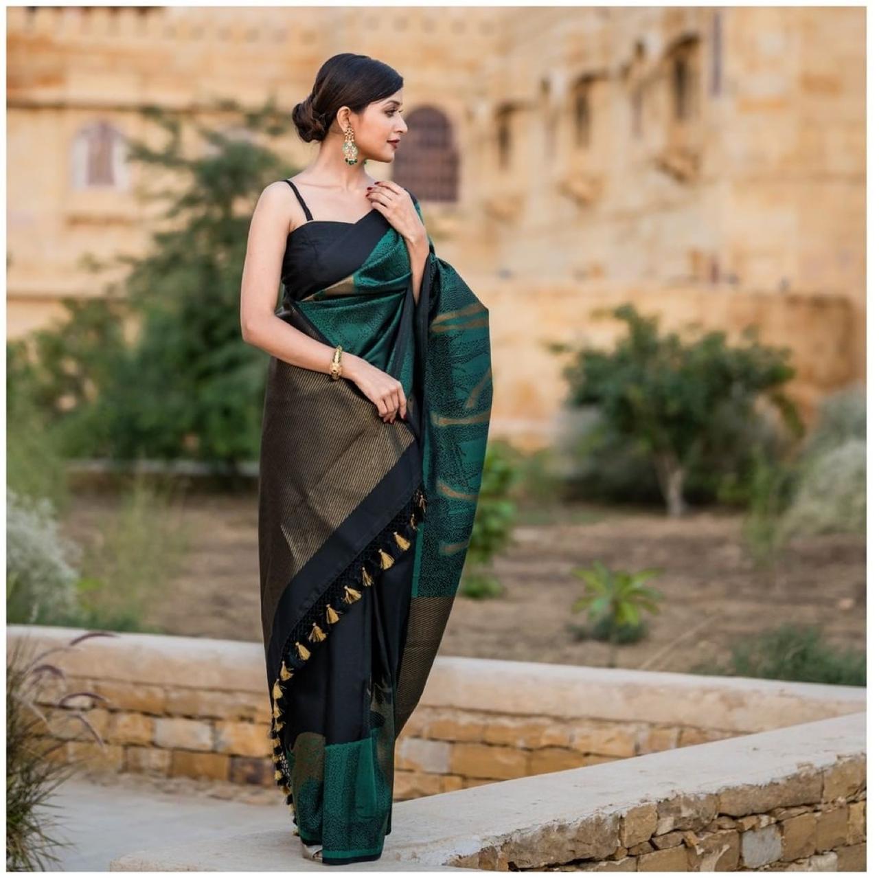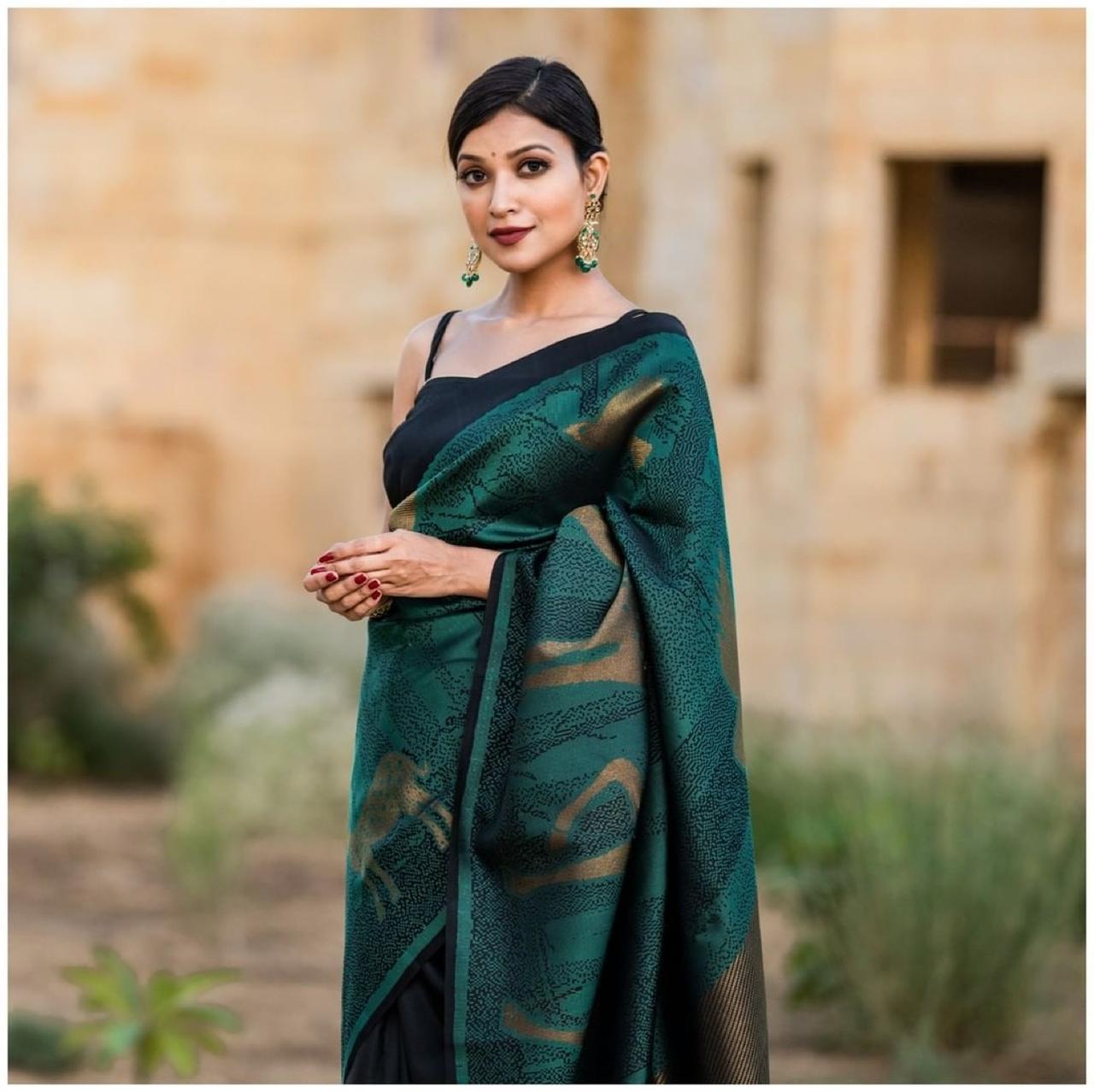 Deserving Rama Soft Banarasi Silk Saree With Beautiful Blouse Piece